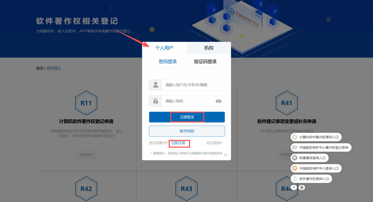 4.点击“立即登记”后进入登录界面。申请人按要求选择相应用户类型登录;如尚未注册账号,可先完成实名注册。