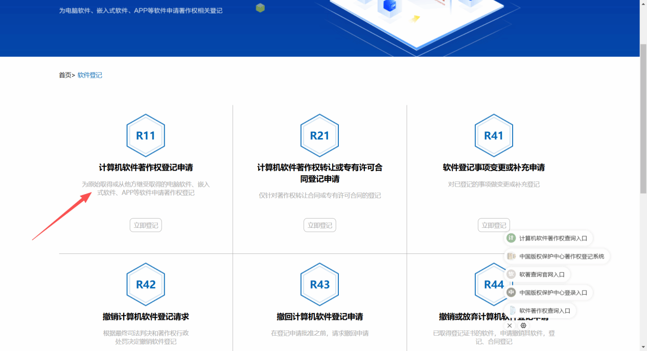 3.进入办理事项选择页面,选择R11计算机软件著作权登记申请,点击立即登记。