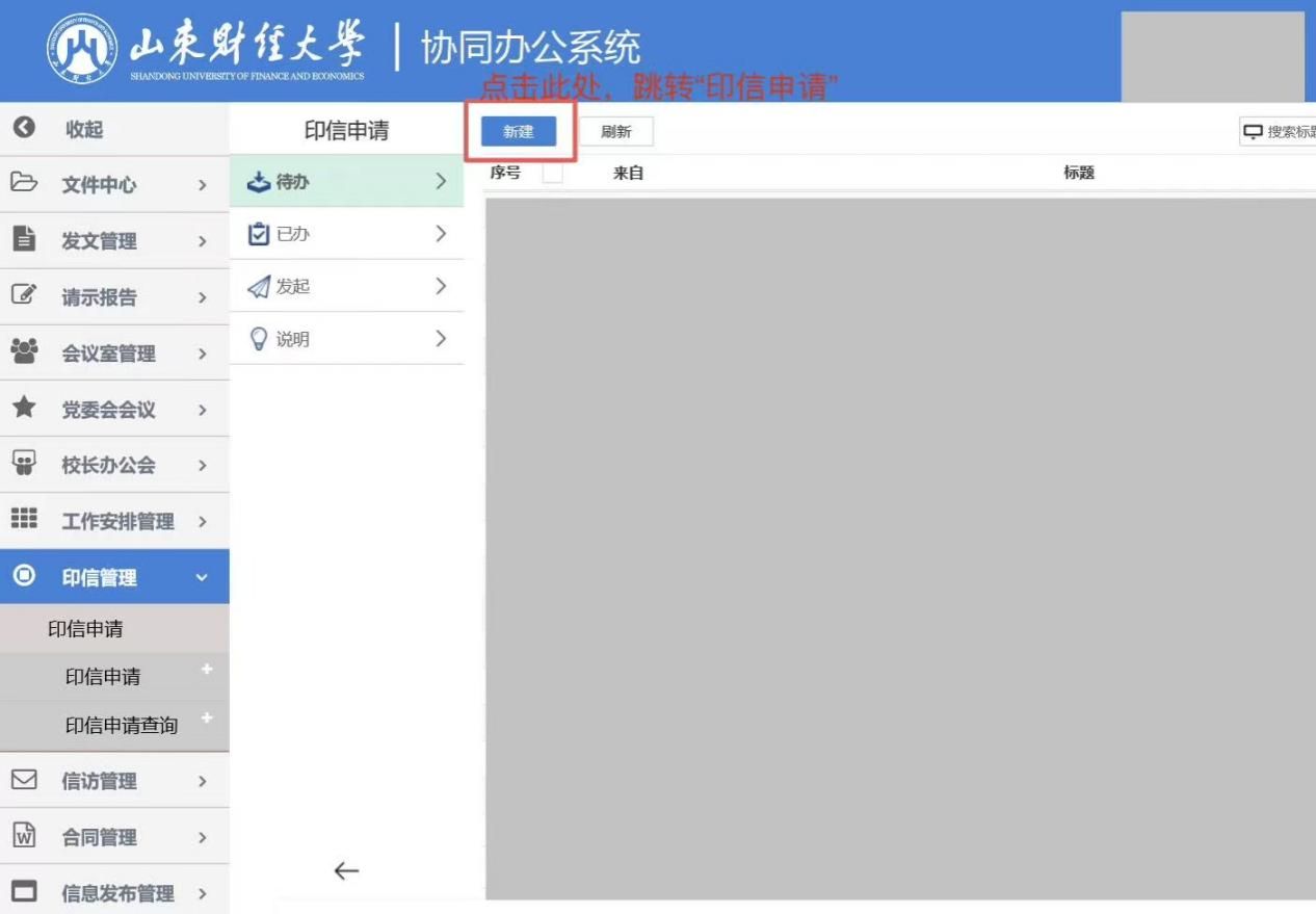 2.申请人登录学校协同办公系统后,按要求新建印信申请事项,进入《山东财经大学印信申请审批单》页面,填写相关信息并提交审批。