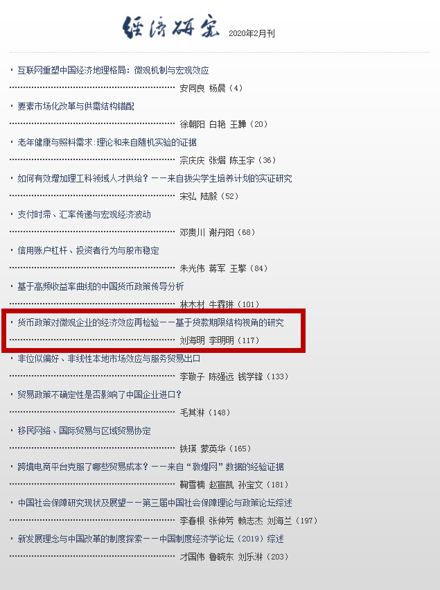 近日,金融学院青年教师刘海明、李明明合作撰写的论文《货币政策对微观企业的经济效应再检验——基于贷款期限结构视角的研究》在《经济研究》2020年第2期上发表。