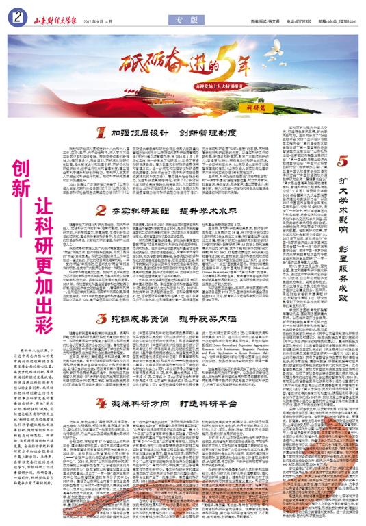 五年来,科研处始终把建设“财经特色名校”和“一流学科建设”摆在首要位置,树立大局意识、改革意识、导向意识、服务意识,通过顶层设计、制度创新,努力为支撑一流学科和特色名校建设提供坚强的科研和学术保障。