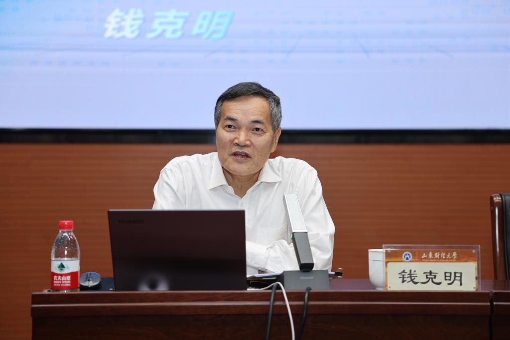 5月31日下午,由我校主办、科研处、学科建设办公室承办的山东财经大学“燕山大讲坛”(第六期)在燕山校区和圣井校区同时举行。全国政协常委、科技教育卫生体育委员会副主任、全国国际商务专业学位研究生教育指导委员会主任委员、商务部原副部长钱克明作了题为《国际经济体系面临的新形势与中国应对》的学术报告。校党委书记查玉喜出席本次大讲坛,校长洪俊杰主持本次大讲坛。