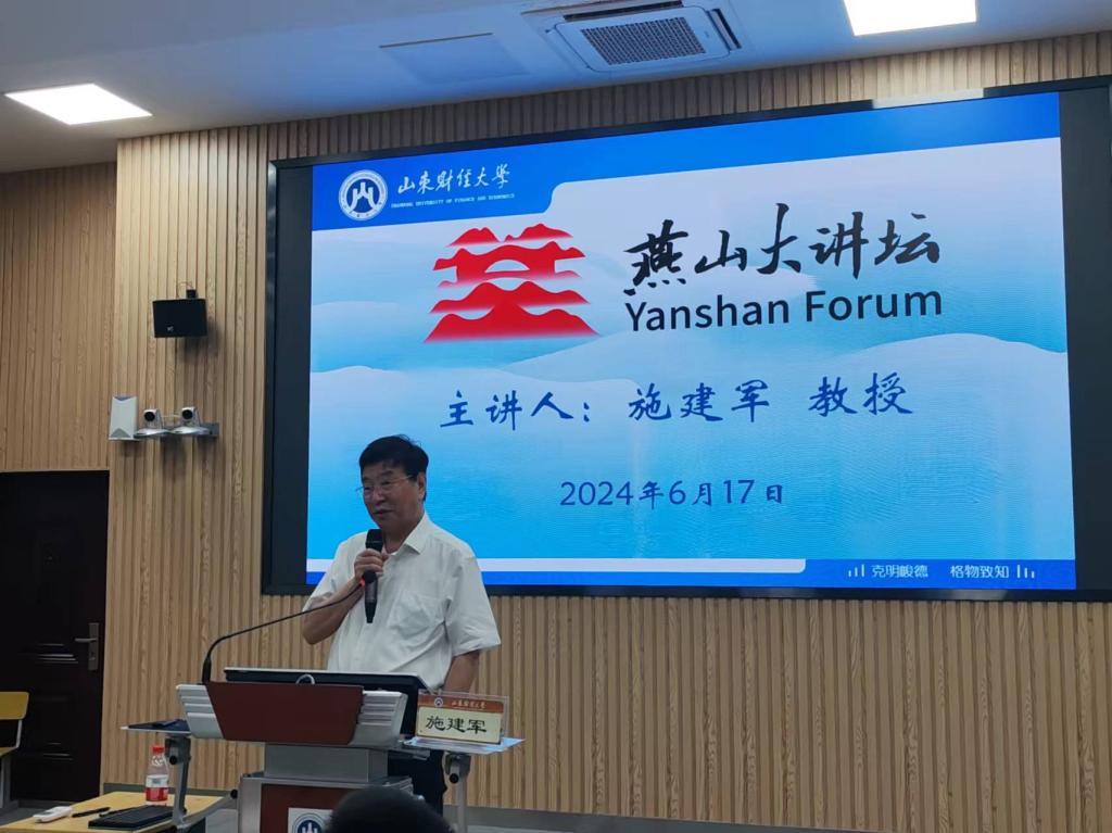 6月17日下午,由我校主办,科研处、学科建设办公室、会计学院、统计与数学学院承办的“燕山大讲坛”(第九期)在燕山校区举行。前南京大学常务副校长、对外经济贸易大学校长、中国教育审计学会会长、中国统计学会副会长、中国企业管理研究会副会长,现中国财经教育分会理事长施建军教授作了题为《“新质生产力”与“创新力”思考》的学术报告。