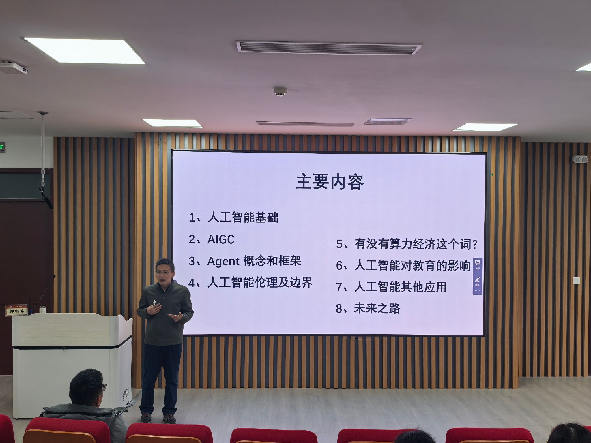 郭继东以“人工智能基础”为切入点,系统拆解人工智能核心定义、发展脉络与技术底层逻辑,清晰梳理技术演进关键节点,帮助在场听众快速构建起对人工智能的基础认知框架。随后,讲座聚焦人工智能热门应用方向,深入解读AIGC技术的原理内核、落地场景与发展挑战;详细剖析Agent概念的核心内涵、整体架构及应用前景,让听众直观感受到人工智能向“智能化”深度演进的内在逻辑与无限可能。