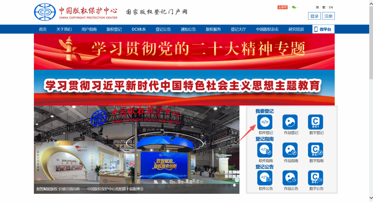 2.进入中国版权保护中心网站首页,点击软件登记。