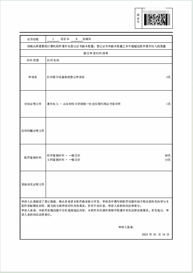 (注:著作权人原则上建议采用“山东财经大学”单独署名方式。采用“山东财经大学+个人”共同署名的方式,需补充提交相关协议材料,并按程序办理审核盖章手续。为简化流程、提高办理效率,建议优先选择“山东财经大学”单独署名。)
