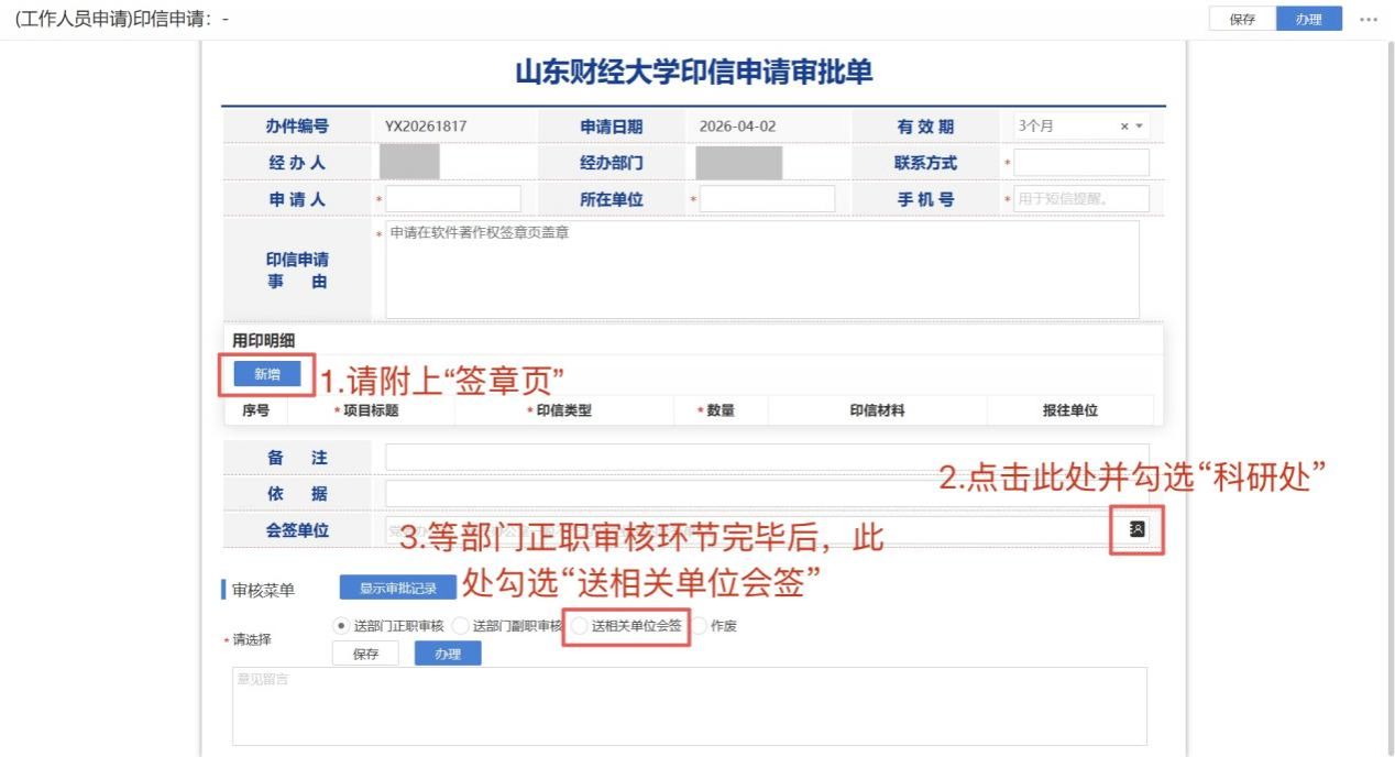 2.申请人登录学校协同办公系统后,按要求新建印信申请事项,进入《山东财经大学印信申请审批单》页面,填写相关信息并提交审批。
