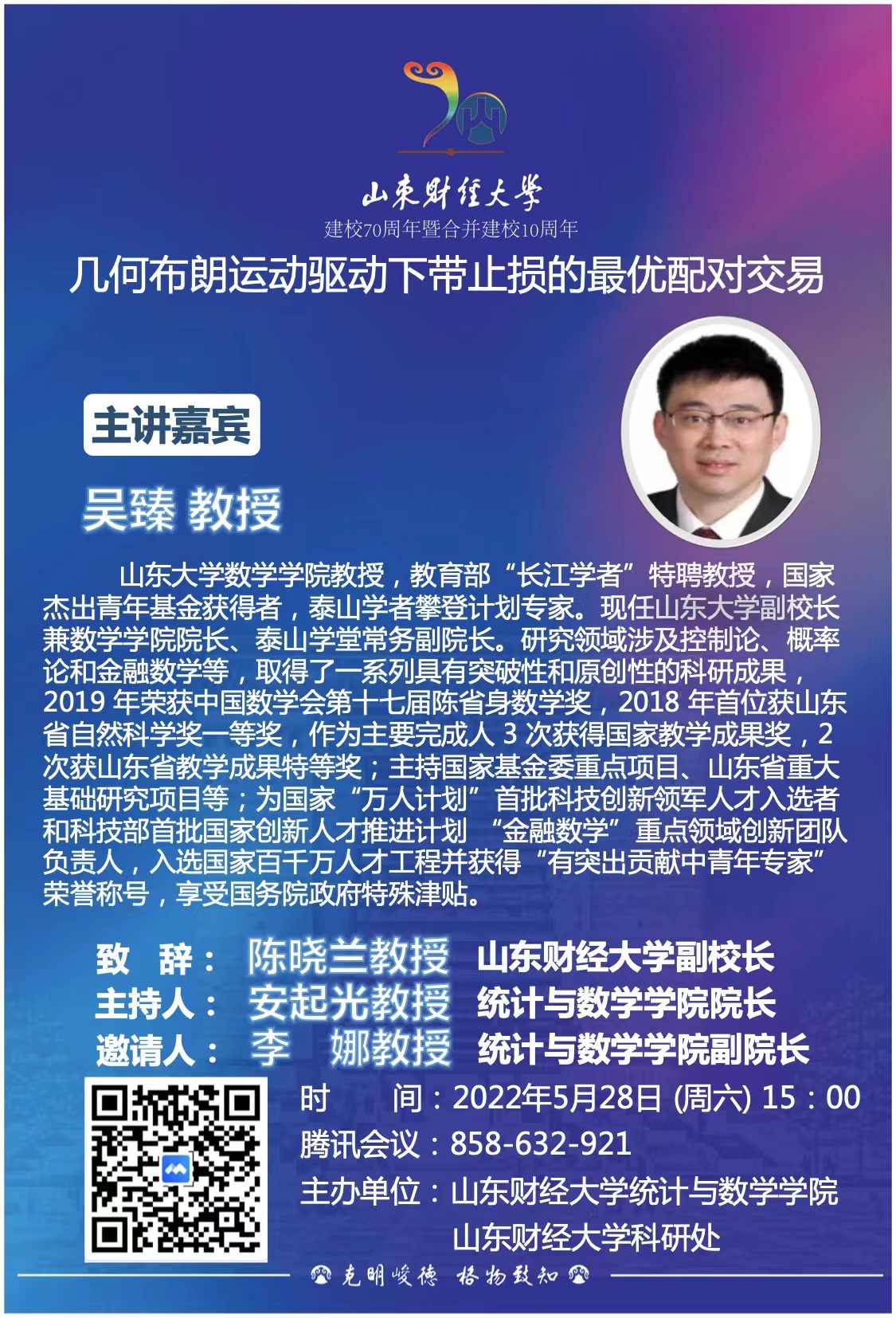 吴臻,山东大学数学学院教授,国家级人才,国家杰出青年基金获得者,泰山学者攀登计划专家。现任山东大学副校长兼数学学院院长、泰山学堂常务副院长。担任国家自然科学基金数学天元基金学术领导小组成员,山东数学会理事长,国际控制理论权威期刊SIAM Journal on Control and Optimization、国家基金委英文期刊Fundamental Research数学物理领域编委、SCI学术期刊Statistics & Probability Letters、国际学术期刊Probability, Uncertainty and Quantitative Risk、Partial Differential Equations and Applications编委。研究领域涉及控制论、概率论和金融数学等,取得了一系列具有突破性和原创性的科研成果,2019年荣获中国数学会第十七届陈省身数学奖,2018年首位获山东省自然科学奖一等奖,作为主要完成人3次获得国家教学成果奖,2次获山东省教学成果特等奖。主持国家基金委重点项目、山东省重大基础研究项目等。为“国家高层次人才特殊支持计划”首批科技创新领军人才入选者和科技部首批国家创新人才推进计划“金融数学”重点领域创新团队负责人,入选国家百千万人才工程并获得“有突出贡献中青年专家”荣誉称号,享受国务院政府特殊津贴。