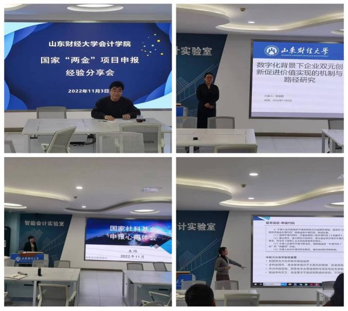 为持续推进有组织的科研,不断提升教师科研水平,推动学院国家“两金”项目申报工作,我院于11月3日下午在智能会计实验室举办国家“两金”项目申报经验分享会。学院党委书记邵文涛、副院长王守海及青年教师参加了活动;院长葛永波、财务管理系主任朱炜、智能会计系副主任李瑞雪和会计学系宋蕾蕾分别介绍了申报国家社科、国家自科的学术历程和经验。分享会由副院长吴大新主持。
