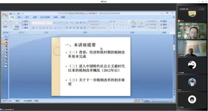 11月17日下午,财政税务学院2022年第7期财税学术讲座以线上方式举行,国家税务总局税收科学研究所原所长、研究员刘佐做了题为“十八大以来中国税制改革的回顾和展望”的学术报告。财税学院院长李森主持会议,财税学院部分青年教师参加会议。