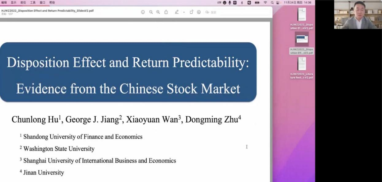 11月24日下午,财政税务学院2022年第5期闻道学术论坛在线上举行。青年博士胡春龙报告了与华盛顿州立大学George J. Jiang教授、上海对外经贸大学万孝园教师、暨南大学朱东明教授合作完成的英文工作论文(按姓氏排序):《Disposition Effect and Return Predictability: Evidence from the Chinese Stock Market》,研讨会由青年博士尹鸿飞主持。