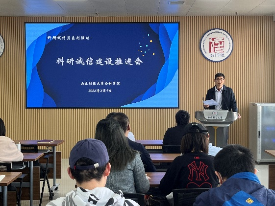 吴大新首先总结了上一阶段的科研诚信建设工作,再次传达了中共中央办公厅、国务院办公厅《关于进一步加强科研诚信建设的若干意见》、省教育厅《关于进一步加强高等学校科研诚信工作的意见》等重要文件精神,并强调,“信”是会计学院的底色,全院师生应争做科研诚信的排头兵,更应将“他律”转换为“自律”,将“诚信”二字内化为自己的信念,不断提升科研水平和道德水准。