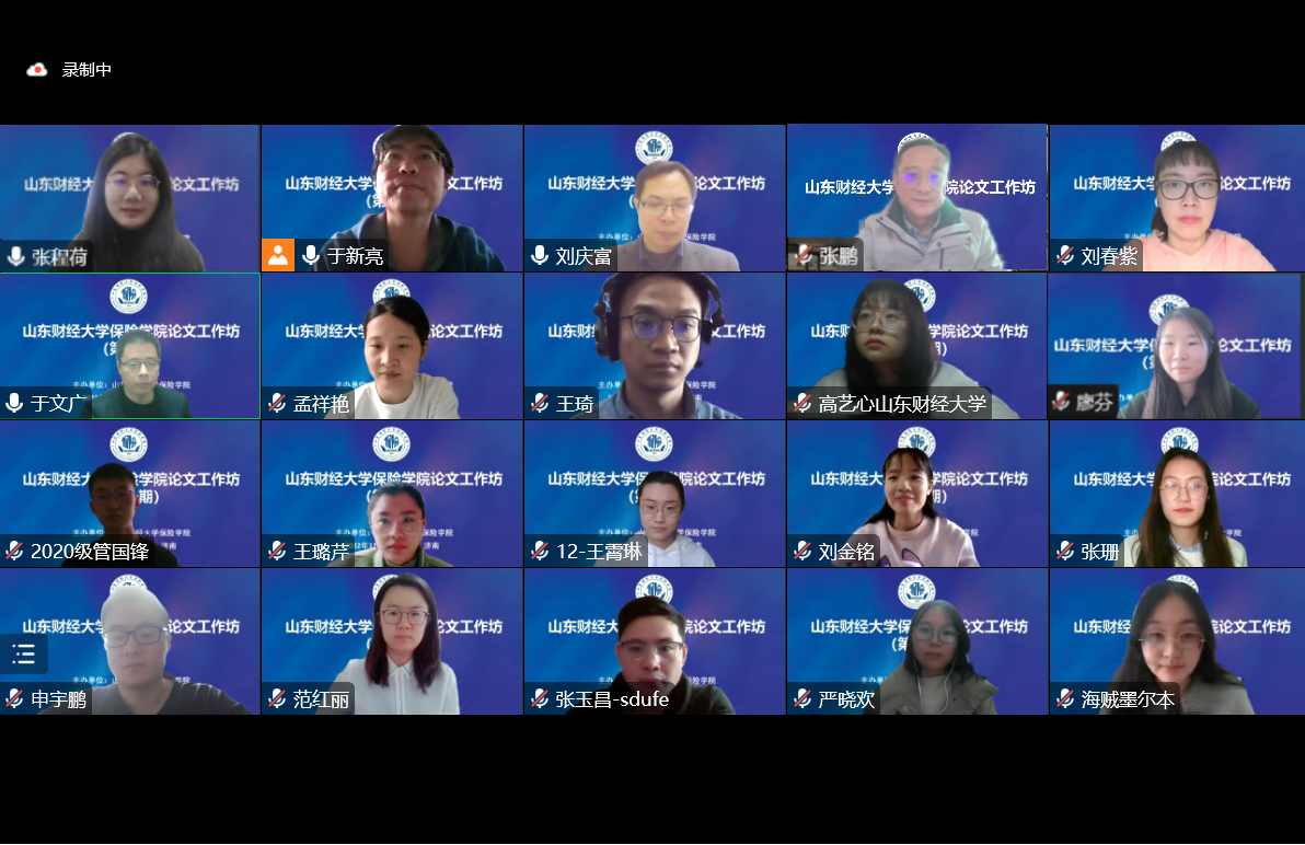 12月16日下午14:00,山东财经大学保险学院第一期论文工作坊成功举办。经过前期精心筹备和广泛动员,本期论文工作坊在保险学院院内征集工作论文共计20篇,涉及保险、精算和医养健康保障等经济管理领域的众多热点话题。保险学院有幸邀请到来自复旦大学的刘庆富院长和来自西南财经大学的张鹏副研究员两位具有丰富论文评审经验的评审专家对论文进行线下评阅和线上点评。本期论文工作坊由保险学院副院长于新亮教授主持。