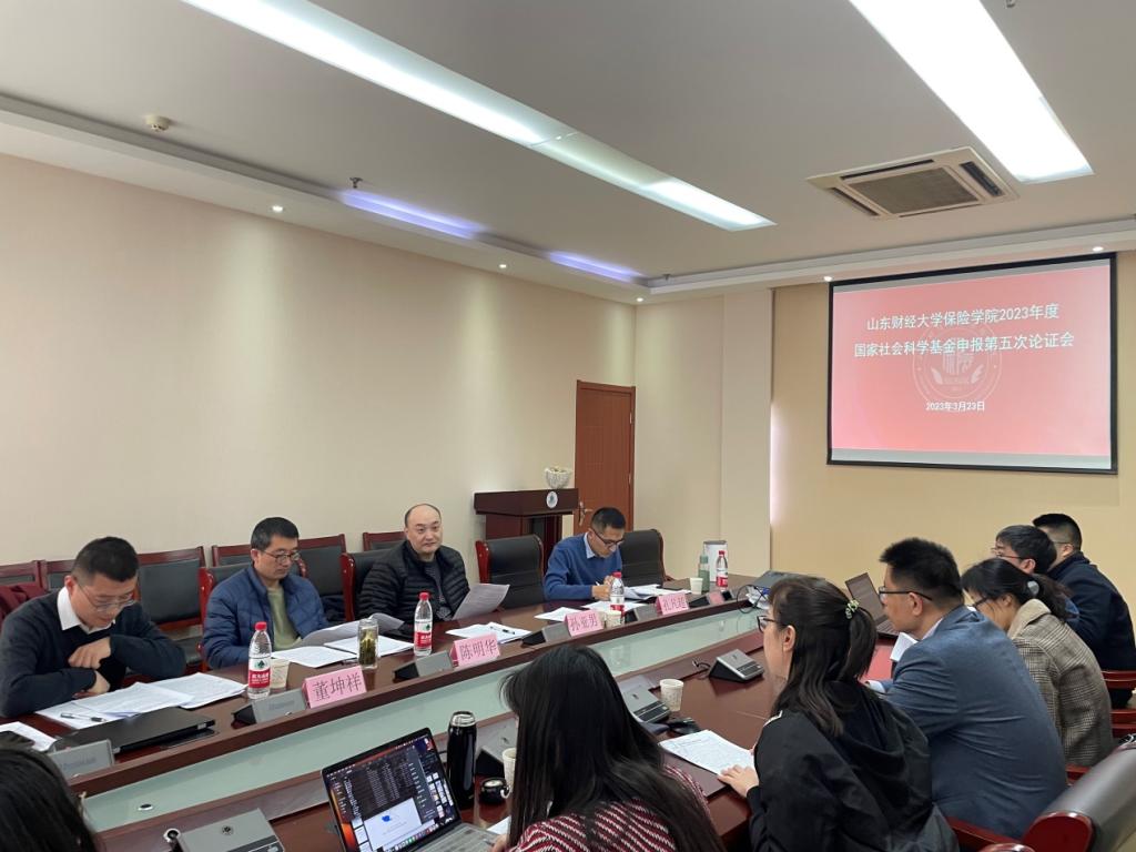 为有序推进2023年度两金项目申报工作,进一步提升国家社会科学基金申报书质量,保险学院于3月23日13:30在舜耕校区实验楼407会议室举办第五轮申报论证会,论证氛围热烈,时间持续近六个小时。此次论证会特别邀请经济学院陈明华教授、孙亚男教授,管理科学与工程学院董坤祥副教授,统计与数学学院孔凡超老师作为论证专家做现场点评,保险学院院长于文广教授主持,副院长于新亮教授、项目申报负责人及部分师生参加论证会。