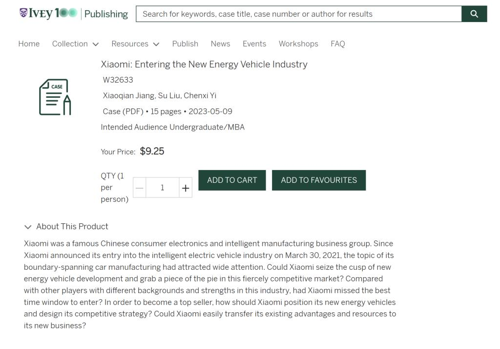 近日,由我院江筱倩博士(第一作者)、工商管理学院刘素教授及研究生伊晨喜撰写的案例“Xiaomi: Entering the New Energy Vehicle Industry”(可译为:小米:进入新能源汽车产业)(案例编号:W32633)发表于国际知名的商业案例库Ivey Publishing,并面向全球168个国家超过25000个学院和教师出版发行。