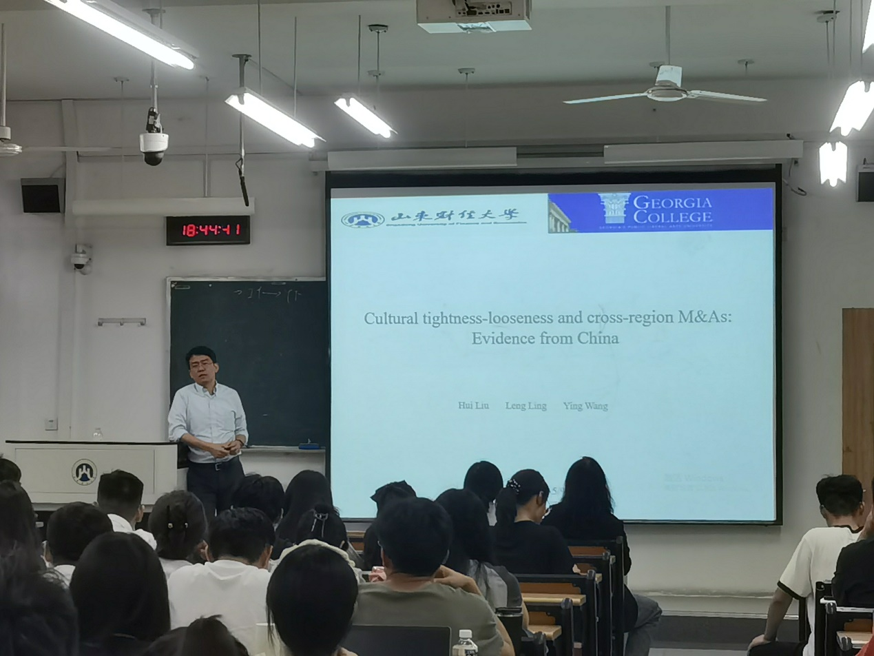 2023年5月10日晚上,由山东财经大学金融学院、山东财经大学金融国际研究中心和山东省金融产业优化与区域管理协同创新中心共同主办的第24期“泰山学术训练营”在舜耕校区3号教学楼309教室举行。美国Georgia College & State University金融学终身教授、山东财经大学特聘教授凌崚老师应邀做客训练营并分享其近期研究成果。本次讲座题目为“Cultural tightness-looseness and inter-regional M&As: Evidence from China”,由金融学院副院长王营教授主持。金融学院副院长王倩副教授、部分教师和研究生参加了此次讲座。