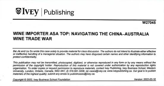 阅读链接:https://www.iveypublishing.ca/s/product/wine-importer-asa-top-navigating-the-chinaaustralia-wine-trade-war/01t5c00000D5kzwAAB。