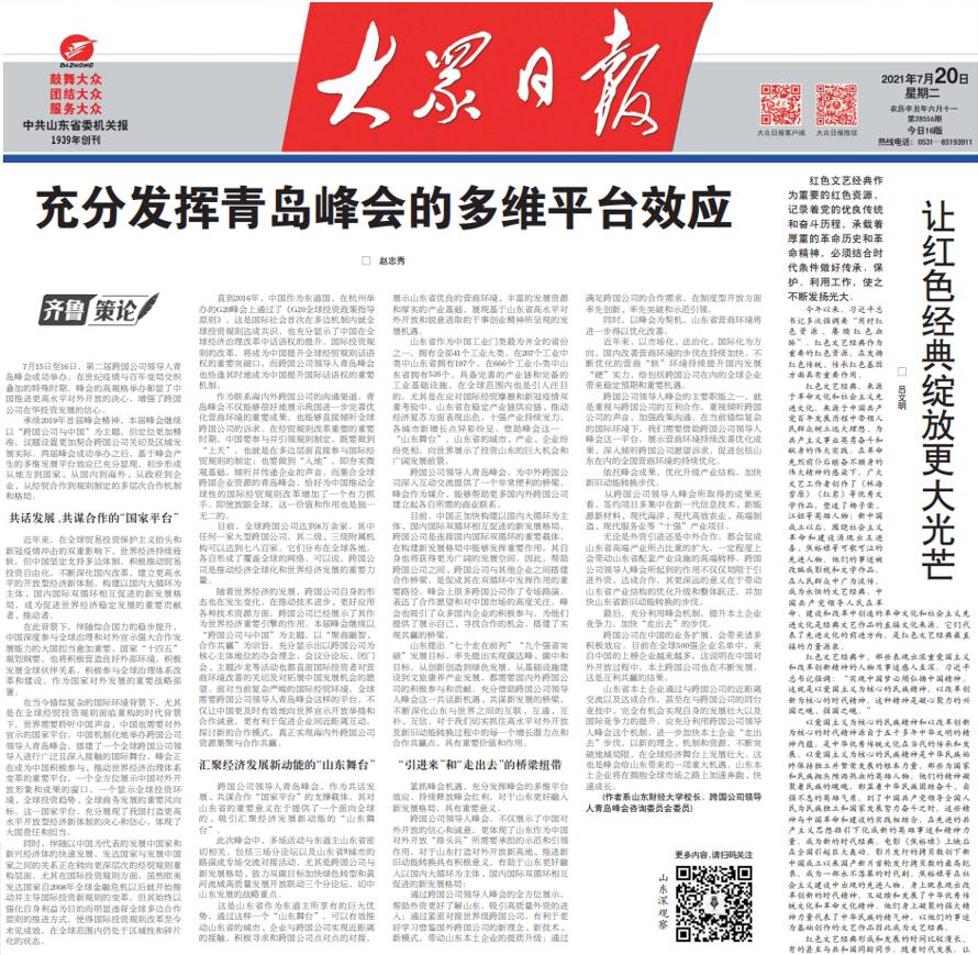 山东提出“七个走在前列”“九个强省突破”发展目标,率先提出实现碳达峰、碳中和目标,从创新创造到绿色发展,从基础设施建设到文旅康养产业发展,都需要国内外跨国公司的积极参与和贡献。充分借助跨国公司领导人峰会这一共话新机遇、共谋新发展的桥梁,不断深化山东与世界之间的互联、互通、互补、互信,对于我们切实抓住高水平对外开放及新旧动能转换过程中的每一个增长潜力点和合作共赢点,具有重要价值和作用。