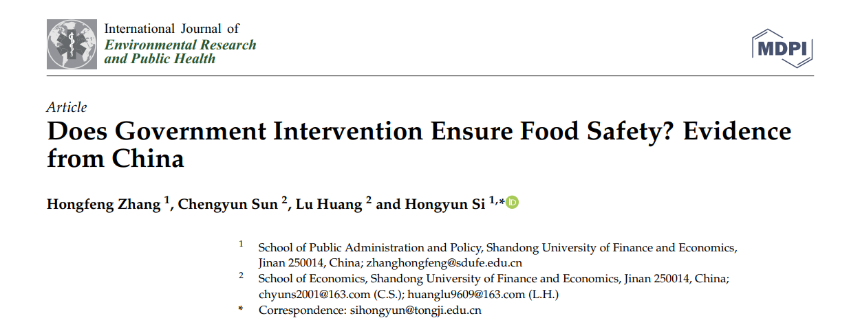 近日,公共管理学院张红凤教授作为第一作者的论文《Does Government Intervention Ensure Food Safety? Evidence from China》于2021年4月在期刊《International Journal of Environmental Research and Public Health》第18卷发表。该期刊为SSCI一区,系我校A1类期刊。