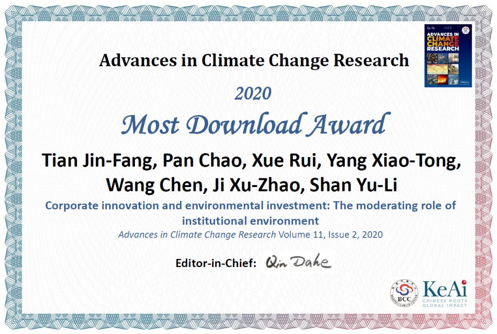 田金方教授及其合作者在期刊Advances in Climate Change Research(Volume 11, Issue 2, 2020)上发表的学术论文Corporate innovation and environmental investment: The moderating role of institutional environment,获得2020年度期刊“高下载论文奖”。该期刊是中科院SCI分区二区期刊。最新影响因子3.967,为我校A1类期刊。