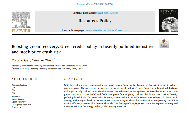 会计学院葛永波教授和其指导的博士研究生朱玥晓合作撰写的论文Boosting green recovery:Green credit policy in heavily polluted industries and stock price crash risk在期刊Resources Policy发表。该期刊是JCR一区SSCI期刊,影响因子为8.222,属我校A1类期刊。