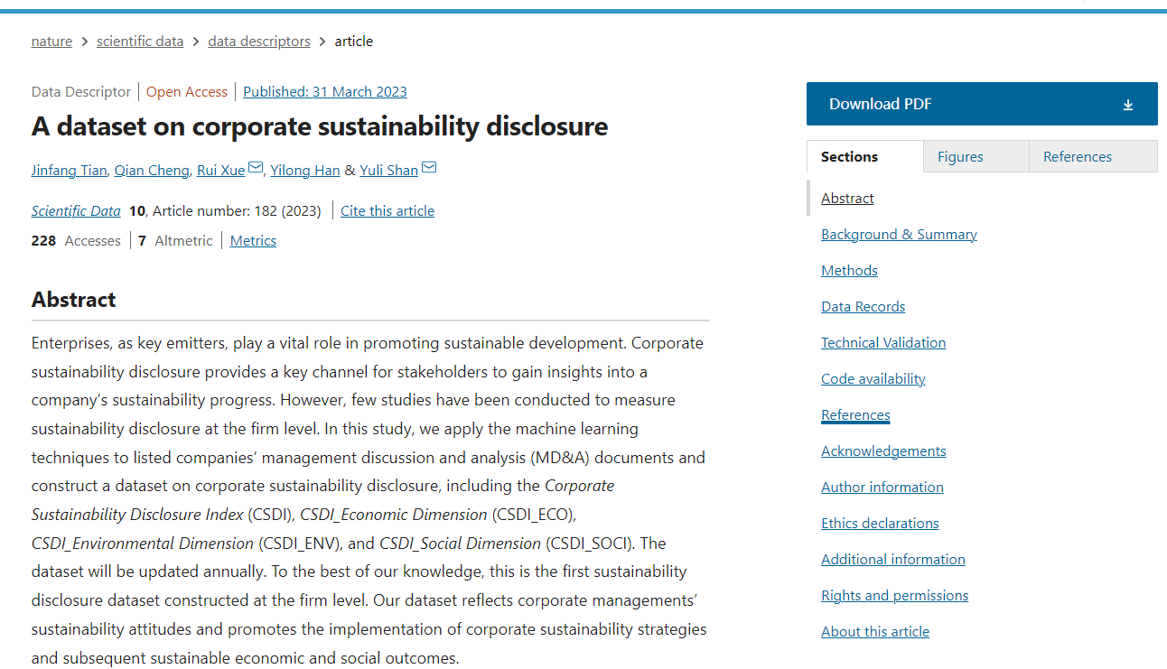近日,统计与数学学院(统计交叉科学研究中心)田金方教授合作团队构建的企业可持续性信息披露指数以期刊论文“A dataset on corporate sustainability disclosure”的形式发表于Nature子刊《Scientific Data》(https://doi.org/10.1038/s41597-023-02093-3)。该期刊实时影响因子12.5,JCR分区Q1,系我校A1类期刊。