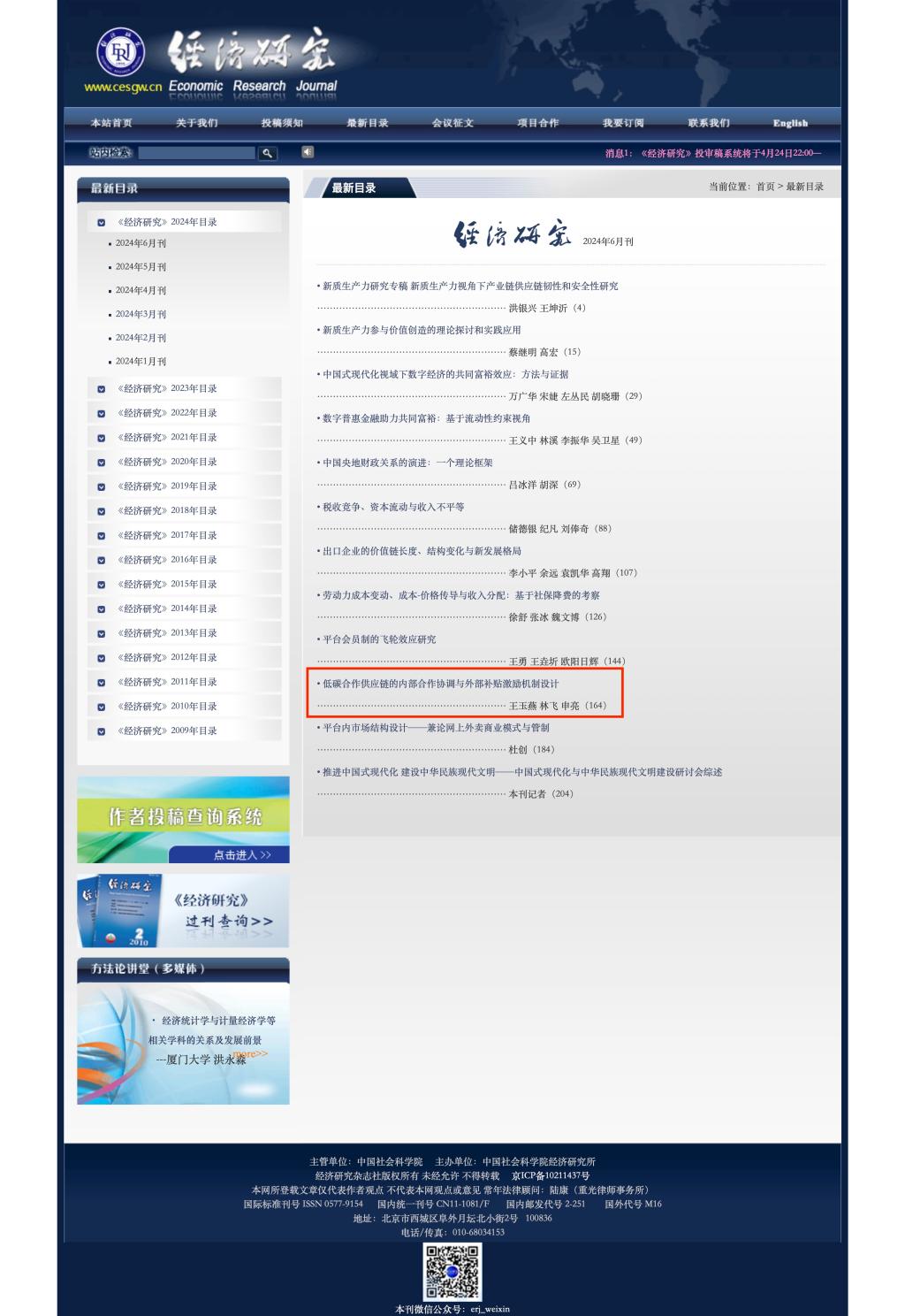 管理科学与工程学院王玉燕教授与财政税务学院申亮教授、林飞博士合作撰写的论文《碳合作供应链的内部合作协调与外部补贴激励机制设计》在《经济研究》2024年第6期发表。该刊为我校特类期刊。